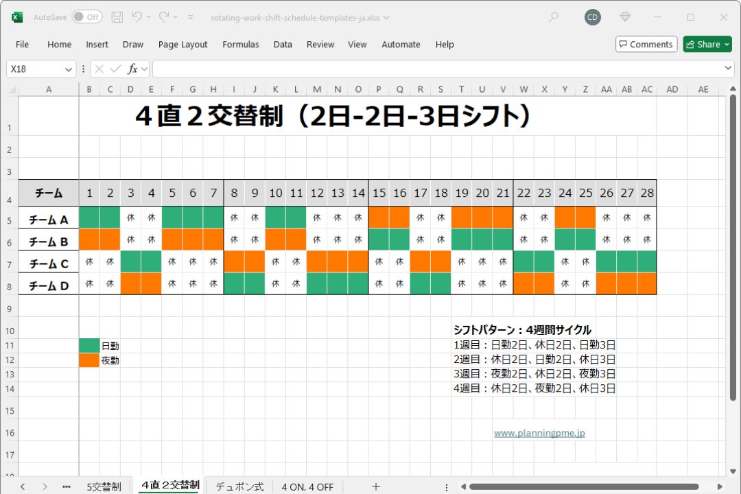 4直2交替制(2日-2日-3日)シフトを簡単に作成する方法をお探しですか? PlanningPMEまたはExcel無料スケジュールテンプレートで4直2交替制(2日-2日-3日)シフトをすばやく作成・管理することができます。
