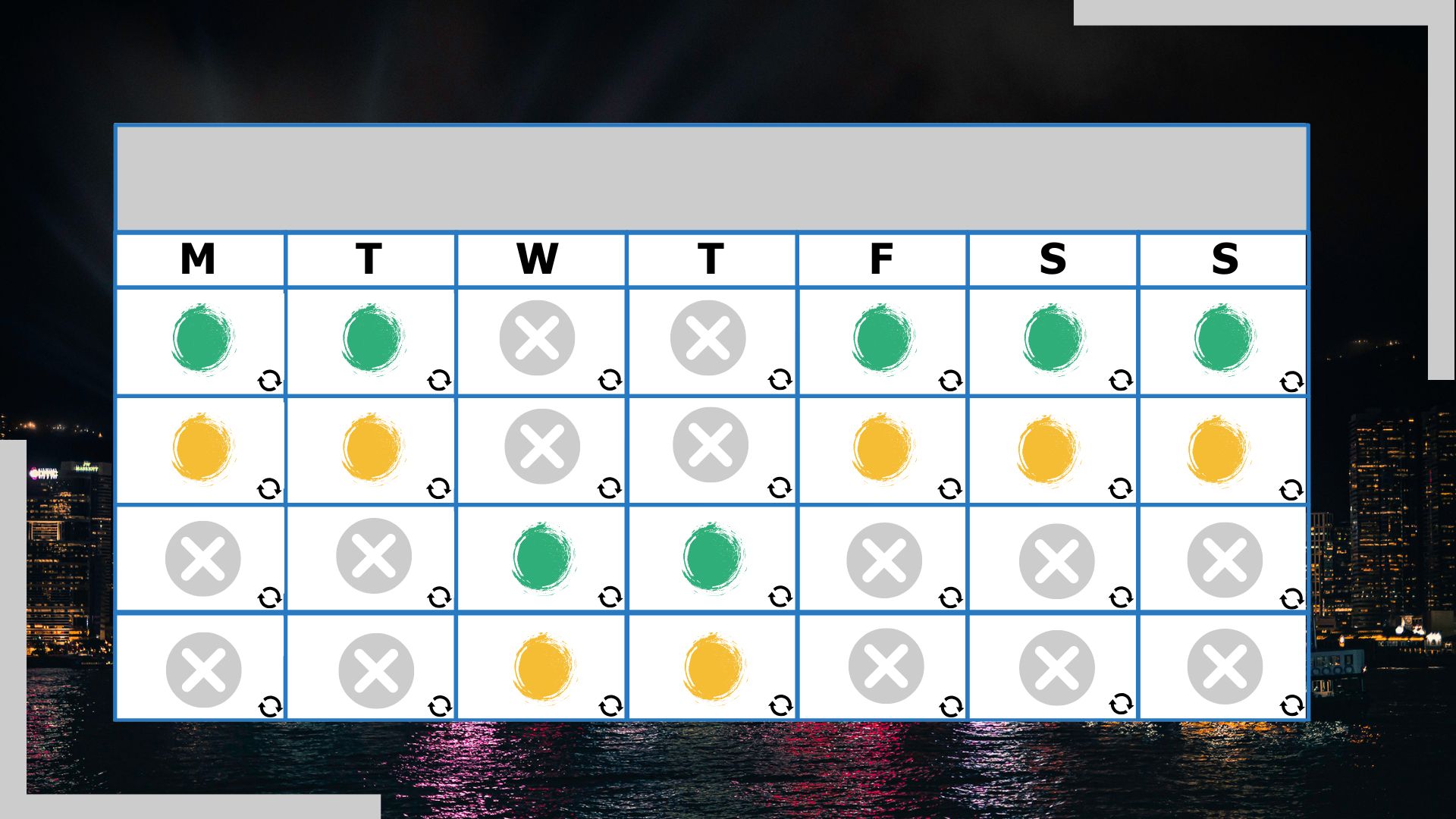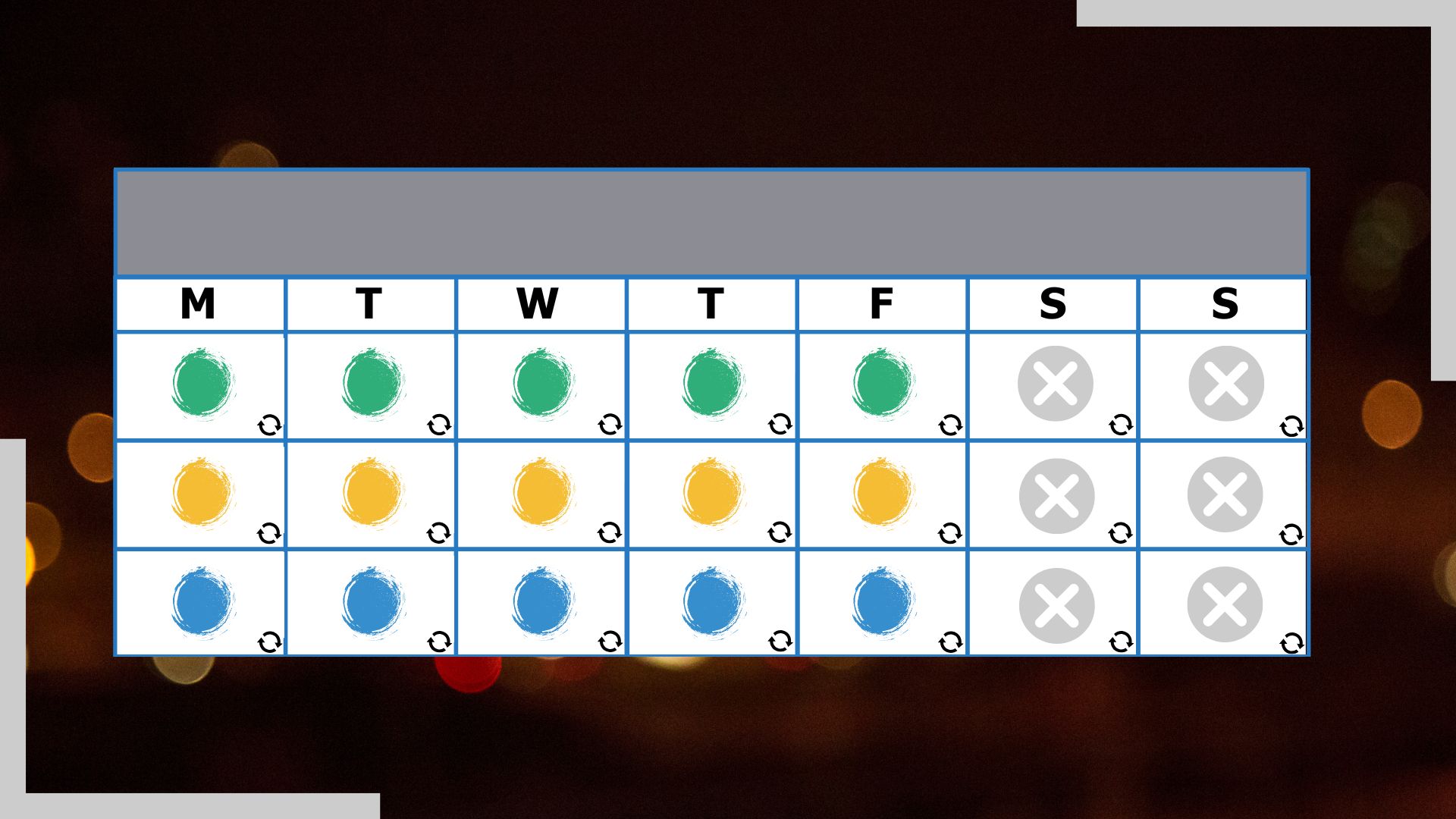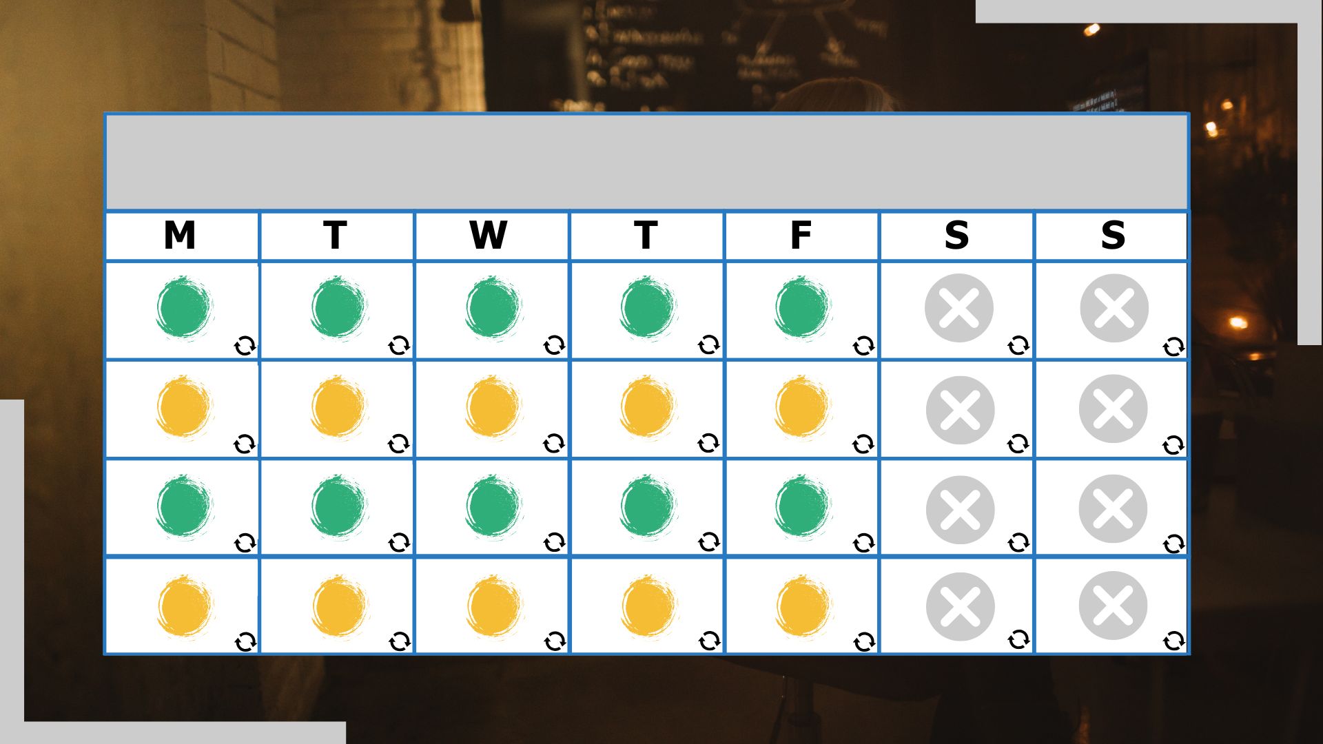 まずローテーションのパターンを決める必要があります。4週間ごとに繰り返される8つの異なるシフトパターンを作成します。